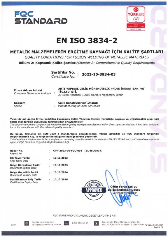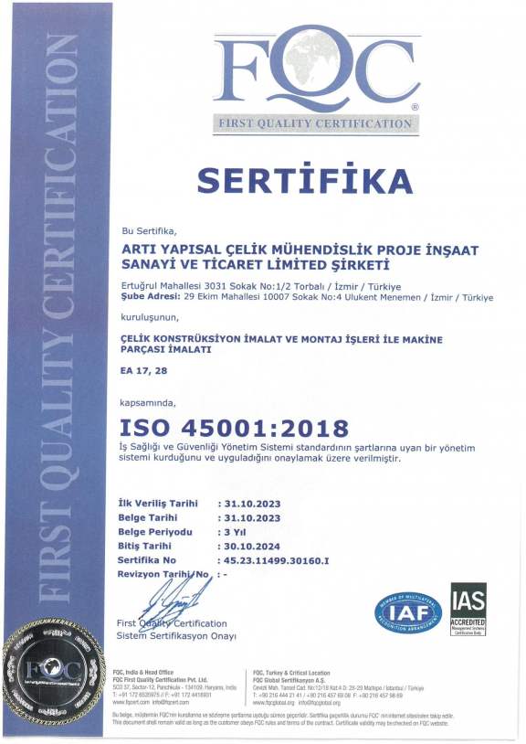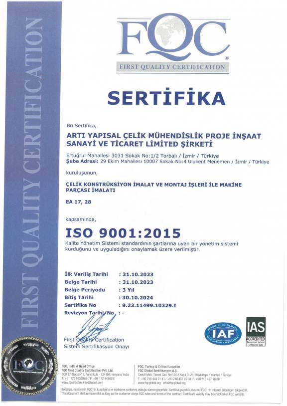 Bu vizyon ışığında Kalite Kontrol ve Yönetim Sistemleri Departmanı faaliyete başlamış, ISO 9001:2015, ISO 14001:2015, ISO 45001:2018, EN1090-2, ISO 3834-2 sertifikaları alınmıştır.